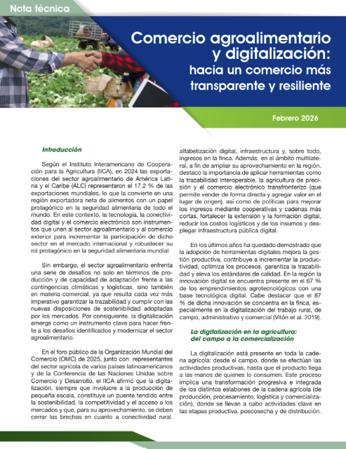América Latina y el Caribe se consolida como un pilar fundamental de la seguridad alimentaria mundial, aportando el 17.2% de las exportaciones agroalimentarias globales. No obstante, el sector enfrenta retos significativos en productividad, trazabilidad y adaptación climática. Ante este panorama, la digitalización surge como un motor estratégico para modernizar la cadena de valor, desde la agricultura de precisión en las fincas hasta el comercio electrónico transfronterizo. Herramientas como sensores de humedad y plataformas de gestión optimizan recursos, mientras que la trazabilidad interoperable facilita el cumplimiento de normativas internacionales y fortalece la confianza del consumidor. A pesar del potencial de la innovación, evidenciado en el 67% de los emprendimientos agrotecnológicos regionales, persistentes brechas limitan su impacto. La desigualdad en la conectividad rural es crítica, ya que solo el 25% de estos hogares tiene acceso a internet. Asimismo, la falta de marcos regulatorios sobre el uso de datos y la limitada articulación público-privada frenan el desarrollo institucional. Para superar estos obstáculos, se recomienda invertir en infraestructura digital, promover plataformas regionales como las Ventanillas Únicas de Comercio Exterior y fomentar programas de alfabetización digital. En conclusión, una gobernanza colaborativa y el apoyo técnico a pequeños productores son esenciales para transformar la digitalización en una herramienta de inclusión que garantice un comercio agroalimentario más competitivo, transparente y resiliente.