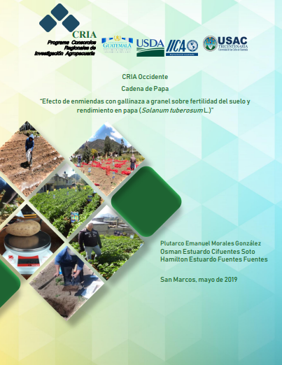 - El estudio evaluó el efecto de la gallinaza a granel (GAG) en el rendimiento de papa y la fertilidad del suelo en San Marcos, Guatemala. Se compararon dosis de GAG de 0, 4000, 6000, 8000 y 10000 kg/ha en suelos franco arenoso y franco arcillo arenoso. Los resultados mostraron que la GAG afectó el rendimiento en ambos suelos, pero sin diferencias estadísticas significativas entre dosis. Los parámetros de fertilidad del suelo no mejoraron con la aplicación de GAG. Se observaron variaciones en coliformes totales, pero no aumentos significativos de E. coli, Shigella sp. ni Salmonella sp.