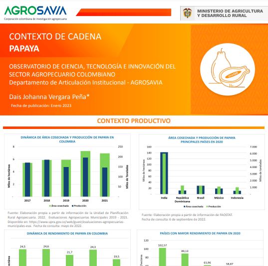 - En esta ficha de contexto se mencionan los aspectos importantes de la cadena de papaya enfocados a su marco productivo, regional, económico, comercio internacional, así como sus perspectivas y tendencias frente al mercado, dando a conocer su entorno de Ciencia y Tecnología e Innovación.