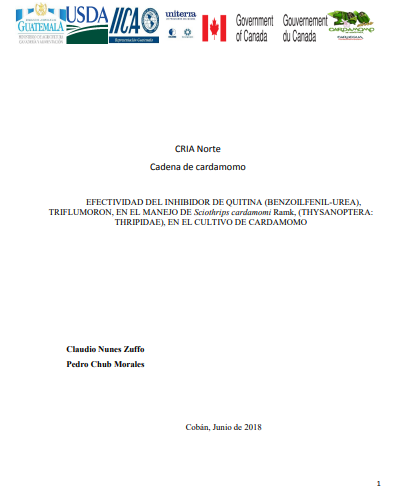 - Este estudio evaluó el uso del inhibidor de quitina triflumuron para controlar el Sciothrips cardamomi, una plaga del cardamomo en Guatemala. El thrips causa daños en las panículas, flores y cápsulas, reduciendo el valor comercial del cardamomo. Se realizaron ensayos en dos municipios de Alta Verapaz, comparando parcelas tratadas con triflumuron y parcelas no tratadas. Los resultados mostraron que el triflumuron redujo significativamente el daño en las vainas de cardamomo. Se concluyó que el triflumuron es un insecticida efectivo contra el thrips, con menor impacto en los polinizadores.