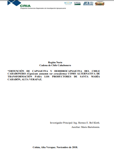- El objetivo del estudio fue obtener capsaicina y dihidrocapsaicina del chile cahabonero (Capsicum annuum var. ceraciforme) como alternativa de transformación para productores en Santa María Cahabón, Alta Verapaz. La metodología incluyó el análisis de muestras de chile, la evaluación de métodos de extracción de oleorresinas (Soxhlet y maceración dinámica) y la posterior cuantificación de capsaicinoides mediante cromatografía líquida de alta resolución (HPLC). Los resultados de la investigación buscan ofrecer opciones de valor agregado a la producción local de chile.