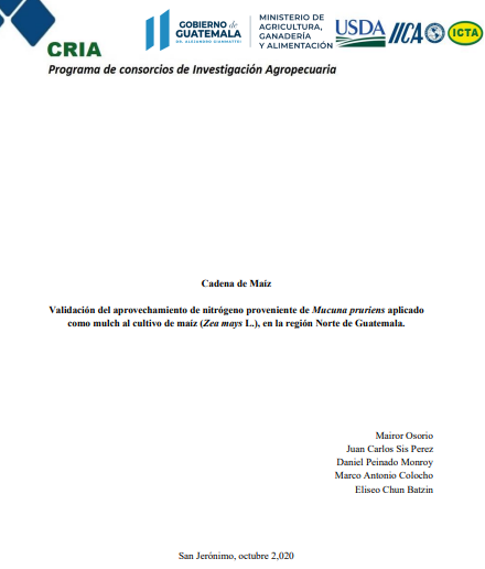 El proyecto evaluó el efecto de la aplicación de Mucuna pruriens como mulch en el rendimiento del maíz, comparado con el manejo tradicional sin abono verde, en la región Norte de Guatemala. Se utilizaron parcelas de prueba en 29 localidades, comparando el rendimiento de maíz con y sin la aplicación de Mucuna pruriens. Los resultados mostraron una diferencia significativa en el rendimiento, con un promedio de 3,617 kg/ha para el sistema con Mucuna pruriens y 2,578 kg/ha para el testigo. El análisis económico indicó un retorno de 0.63 quetzales por cada quetzal invertido en el sistema con Mucuna pruriens, comparado con 0.31 quetzales para el sistema tradicional. Los agricultores valoraron positivamente la tecnología de Mucuna pruriens, destacando la mejora en el rendimiento del grano, control de malezas y retención de humedad del suelo. Se concluyó que el uso de Mucuna pruriens como mulch incrementa significativamente el rendimiento del maíz y se recomendó su promoción a través del Sistema Nacional de Extensión Rural del MAGA.