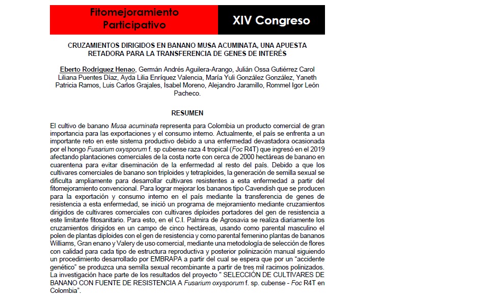 - El cultivo de banano Musa acuminata representa para Colombia un producto comercial de gran importancia para las exportaciones y el consumo interno. Actualmente, el país se enfrenta a un importante reto en este sistema productivo debido a una enfermedad devastadora ocasionada por el hongo Fusarium oxysporum f. sp cubense raza 4 tropical (Foc R4T) que ingresó en el 2019 afectando plantaciones comerciales de la costa norte con cerca de 2000 hectáreas de banano en cuarentena para evitar diseminación de la enfermedad al resto del país. Debido a que los cultivares comerciales de banano son triploides y tetraploides, la generación de semilla sexual se dificulta ampliamente para desarrollar cultivares resistentes a esta enfermedad a partir del fitomejoramiento convencional. Para lograr mejorar los bananos tipo Cavendish que se producen para la exportación y consumo interno en el país mediante la transferencia de genes de resistencia a esta enfermedad, se inició un programa de mejoramiento mediante cruzamientos dirigidos de cultivares comerciales con cultivares diploides portadores del gen de resistencia a este limitante fitosanitario. Para esto, en el C.I. Palmira de Agrosavia se realiza diariamente los cruzamientos dirigidos en un campo de cinco hectáreas, usando como parental masculino el polen de plantas diploides con el gen de resistencia y como parental femenino plantas de bananos Williams, Gran enano y Valery de uso comercial, mediante una metodología de selección de flores con calidad para cada tipo de estructura reproductiva y posterior polinización manual siguiendo un procedimiento desarrollado por EMBRAPA a partir del cual se espera que por un "accidente genético" se produzca una semilla sexual recombinante a partir de tres mil racimos polinizados. La investigación hace parte de los resultados del proyecto " SELECCIÓN DE CULTIVARES DE BANANO CON FUENTE DE RESISTENCIA A Fusarium oxysporum f. sp. cubense-Foc R4T en Colombia". Palabras clave: Poliploidía, semilla sexual recombinante, partenocarpia.