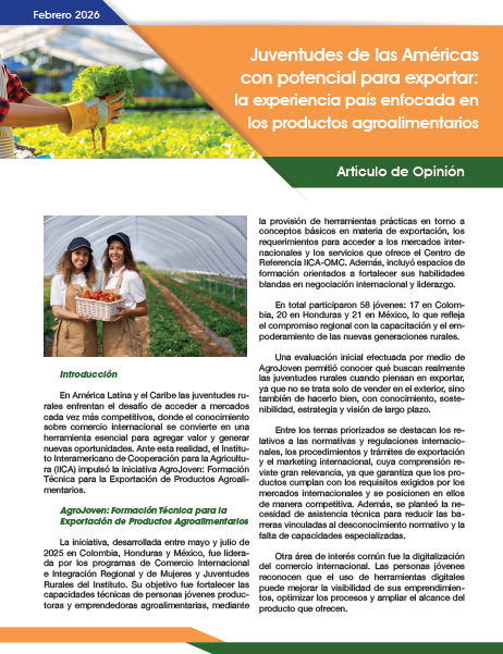 - La juventud rural de América Latina y el Caribe enfrenta el desafío de acceder a mercados competitivos donde el comercio internacional es clave para agregar valor. Ante esto, el IICA impulsó AgroJoven, una iniciativa de formación técnica desarrollada en Colombia, Honduras y México durante 2025. El programa empoderó a 58 jóvenes emprendedores con herramientas sobre marketing internacional, normativas de exportación y digitalización. Los participantes destacaron su compromiso con la sostenibilidad, el comercio justo y el desarrollo rural a largo plazo. Invertir en la juventud es vital para garantizar la seguridad alimentaria y el relevo generacional ante el envejecimiento poblacional. El éxito requiere la articulación entre los sectores público, privado y organismos internacionales para proveer financiamiento inclusivo, mentorías y metodologías de "aprender haciendo". Empoderar a la juventud de hoy asegura sistemas agroalimentarios más competitivos en el futuro.