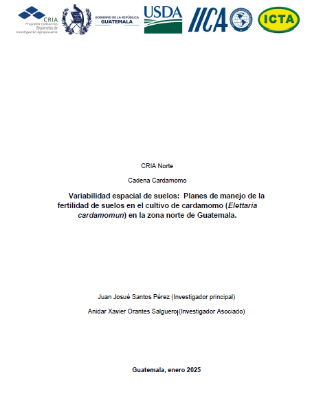 - El uso de fertilizantes químicos en cultivos agrícolas ha sido poco estudiado, utilizando dosis que tienen una vigencia de más de 20 años, en el cultivo de cardamomo no se han estudiado de manera profunda, es decir, no se cuentan con estudios de fertilidad de suelos en áreas locales o específicas de Guatemala que estén enfocados no solo en las limitantes nutricionales, sino en la distribución y variación espacial de los elementos químicos y físicos. Por lo que el objetivo del estudio fue la generación de planes de manejo de la fertilidad de suelos por zona homogénea en el cultivo de cardamomo (E. cardamomun) en el norte de Guatemala. Para ello se colectaron 600 muestras de suelo a una profundidad de 0 a 30 cm de profundidad en los departamentos de Alta Verapaz y Baja Verapaz, dando prioridad a parcelas donde se cultiva Cardamomo, georreferenciando cada muestra utilizando GPS, y enviándola para análisis físico y química en el Laboratorio de Suelos del Instituto de Ciencia y Tecnología Agrícolas (ICTA). Los análisis geoespaciales están fundamentados en el mapeo digital de suelos, utilizando para ello los factores formadores del suelo (S=f(CL,O,R,P,T)), donde interviene el clima, organismos, topografía, material parental, tiempo y el error asociado al modelamiento. Se obtuvieron 14 superficies continúas utilizando los métodos de random forest, vecinos más cercanos ponderado, modelos de regresión cubista y maquinas vectoriales, los cuales se validaron mediante validación cruzada utilizando el 20% de la información. Se generaron cuatro áreas homogéneas utilizando 14 modelos de variables de suelos. Identificando que los requerimientos necesarios para producir 100 kg de cápsulas secas por hectárea, está dada por las diferencias encontradas en cada grupo, se debe aplicar fertilizante MAP al Grupo 3 a una dosis de 37.62 kg/ha de P2O5. En cuanto a los Grupos 2 y 4, se recomienda sustituir la fuente de potasio Cloruro de potasio (KCl) por sulfato de potasio (K2SO4). Esta recomendación se debe a que el pH del suelo debe reducirse a menos de 5.8, como indican los autores mencionados anteriormente, adicional al acompañamiento de técnicos locales.