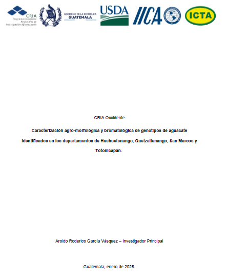 - La investigación se realizó en los municipios de Cabricán y San Martín Sacatepéquez en Quetzaltenango, San Pedro Sacatepéquez en San Marcos y San Bartolo Aguas Calientes en Totonicapán y San Antonio Huista y Jacaltenango en Huehuetenango se localizaron, caracterizaron y georreferenciaron un total de 10 cultivares nativos de aguacate, en alturas comprendidas desde los 1,430 hasta los 2,523 metros sobre el nivel del mar.Se realizaron análisis físico-químicos, enviando muestras de frutos al Laboratorio del Instituto de Nutrición de Centro América y Panamá -INCAP-.En la caracterización morfológica in situ, se empleó el descriptor de aguacate desarrollado por el Instituto Internacional de Recursos Fitogenéticos IPGRI (1995), modificado según código establecido en la Tabla Munsell de colores para plantas, considerando 21 variables. Se realizó análisis de componentes principales, para establecer cultivares sobresalientes para consumo.El análisis de componentes principales realizado a cultivares de aguacate nativos demostró que el cultivar AP1 y AP3, procedentes de Huehuetenango, así como el AP5 procedente de San Marcos se relaciona con las variables de buena producción vigorosidad del árbol, tamaño del fruto y grosor de cascara, por lo que, son potenciales para ser una variedad comercial ya que estas características son ideales para producción.El cultivar AP1y AP4 presentó buena proporción de grasa (21.39% y 20.57% respectivamente), aceptable contenido de grasa y superior al 20% que normalmente presenta la variedad Hass, también presentan buen grosor de epicarpio, ideal para el transporte. Por lo que, se considera que son cultivares con alto potencial para mejora del cultivo.