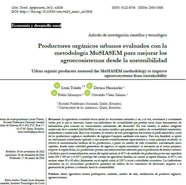 - La agricultura sostenible busca imitar los ecosistemas naturales y ser, a la vez, económica y socialmente viable, por lo que es necesario contar con indicadores de sostenibilidad que puedan servir como herramientas de información para conocer las consecuencias ambientales del desarrollo. En este sentido, el análisis integrado multiescala de la sociedad (MuSIASEM) es un marco analítico que permite un análisis de sostenibilidad cuantitativo, multicriterio y multiescala. Bajo este contexto, el objetivo de esta investigación fue evaluar el perfil metabólico social de los productores orgánicos certificados de Agrupar-Conquito mediante este marco. Para esta finalidad, se aplicó un cuestionario estructurado aplicado a una muestra estadísticamente representativa y, como principal resultado, se obtuvo la caracterización biofísica de los productores, a partir sus medios de vida sostenibles, considerando cinco capitales, donde como actividad generadora de ingresos, el capital económico se encuentra en el sector primario; respecto al capital físico, los productores poseen una infraestructura adecuada para la producción de huertos urbanos y bioferias para la comercialización; acerca del capital natural, el 48 % de unidades de producción posee una superficie entre 200 y 500 m2 y el 88 % participa del sistema de agricultura familiar; en cuanto al capital humano, el 85 % son mujeres entre 38 y 65 años; finalmente, en el capital social, el 100 % asiste a actividades asociativas. Los indicadores calculados en los ecosistemas productivos permiten un análisis de los tomadores de decisiones respecto a la generación de políticas y esfuerzos hacia la sostenibilidad.