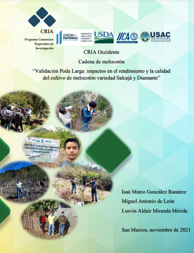 - El objetivo de esta investigación fue validar el impacto de la poda larga en el rendimiento y la calidad de las variedades de melocotón Salcajá y Diamante en el altiplano de San Marcos. La metodología implicó el establecimiento de parcelas experimentales con la aplicación de la poda larga, que consiste en dejar ramas de uno a dos años de edad con seis a ocho yemas florales, y su comparación con el manejo tradicional. Se evaluaron parámetros como el rendimiento, el diámetro de los frutos y la calidad. Los resultados mostraron que la poda larga incrementó significativamente el rendimiento en ambas variedades, especialmente en la variedad Salcajá, donde se observó un aumento del 10% en comparación con el testigo. También se logró un mayor porcentaje de frutos grandes y de mejor calidad. Se concluyó que la poda larga es una técnica eficiente y rentable para mejorar la productividad y la calidad del melocotón, siendo una alternativa sostenible para los productores de la región.