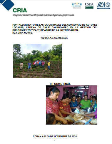 - El Plan Fortalecimiento de las Capacidades del Consorcio de Actores Locales, Cadena de Chile Cahabonero tuvo como objetivo fortalecer las capacidades de gestión de los actores locales para sistematizar conocimiento, identificar necesidades de investigación y transferir resultados. La metodología se basó en la identificación y priorización de necesidades a través de talleres , transformándolas en diez eventos de capacitación con revisión periódica del plan. Se logró una ejecución superior al 100%, con 413 participantes capacitados. Los resultados incluyen la replicación de prácticas de cultivo y transformación , la integración de mujeres al consorcio con oportunidades de ingresos , y la participación activa de productores en proyectos de investigación. Se concluye que el plan fortaleció al consorcio, mejorando las capacidades técnicas y la colaboración, e impulsando la productividad y los ingresos en la cadena del chile cahabonero.