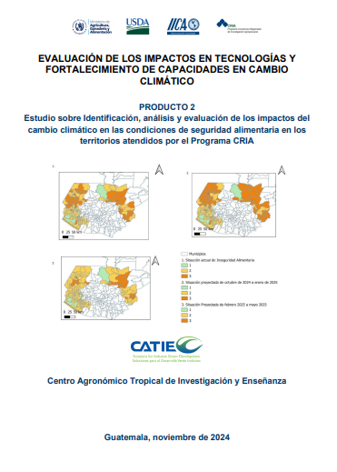 - El estudio tuvo como objetivo identificar, analizar y evaluar los impactos del cambio climático en las condiciones de seguridad alimentaria en los territorios guatemaltecos atendidos por el Programa CRIA. La metodología incluyó un análisis de la situación actual y proyecciones de inseguridad alimentaria para diferentes períodos. Los resultados se enfocaron en diagnosticar la vulnerabilidad de las comunidades ante el cambio climático y sus repercusiones en la disponibilidad y acceso a alimentos.