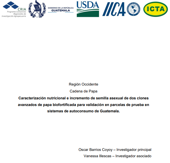- Guatemala cuenta con datos alarmantes de desnutrición y desnutrición crónica; se estima que un 46.5% de los niños padece de algún tipo de desnutrición; cabe destacas que las principales deficiencias nutricionales las representa el Hierro y el zinc, cuya carencia significa retrasos en el desarrollo físico e intelectual de las personas que la padecen. La papa es el cuarto alimento con mayor consumo a nivel mundial; en Guatemala el consumo en áreas del Altiplano puede llegar a alcanzar los 6 kg/día. EL ICTA ha desarrollado dos clones avanzados de papa (ICTA B27 e ICTA B29) que presentan alto contenido de minerales (Zn y Fe), los cuales representan una alternativa en el fortalecimiento de la seguridad alimentaria. Fue necesario el incremento y la caracterización nutricional de los clones mencionados con el fin de llevar a cabo el proceso de validación en zonas productoras del país. Fueron producidas alrededor de 7 toneladas de semilla, con la cual fue posible el establecimiento de 29 parcelas de prueba. Así mismo se llevó a cabo un análisis nutricional, enfatizando las cantidades de Fe y Zn de cada uno de los clones, el cual reveló los niveles superiores de ambos minerales. La producción de ICTA B29 permitió completar el proceso de validación del clon, lo que permitiría liberar la primera variedad de papa biofortificada en Guatemala.El clon ICTA B29 destacó por su alto contenido de Hierro y Zinc de acuerdo con los datos proporcionados por el laboratorio del Centro Nacional de Tecnología Agropecuaria y Forestal de El Salvador.