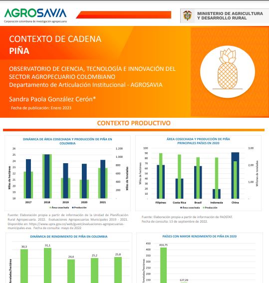 - En esta ficha de contexto se mencionan los aspectos importantes de la cadena de piña enfocados a su marco productivo, regional, económico, comercio internacional, así como sus perspectivas y tendencias frente al mercado, dando a conocer su entorno de Ciencia y Tecnología e Innovación.