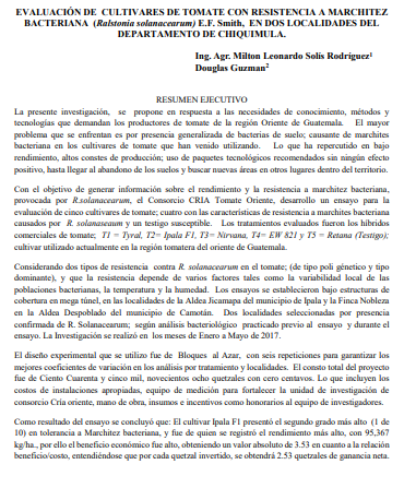 - La investigación evaluó cinco cultivares de tomate en dos localidades de Chiquimula para generar información sobre su rendimiento y resistencia a la marchitez bacteriana causada por Ralstonia solanacearum. El estudio se realizó de enero a mayo de 2017, utilizando un diseño de bloques completos al azar. Los resultados indicaron que el cultivar Ipala F1 presentó alta tolerancia a la marchitez bacteriana y el mayor rendimiento, con un beneficio económico favorable.