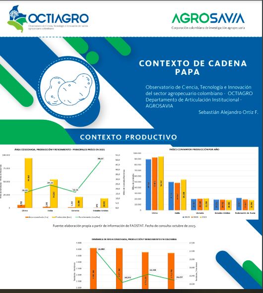 - En esta ficha de contexto se mencionan los aspectos importantes de la cadena de papa enfocados a su marco productivo, regional, económico, comercio internacional, así como sus perspectivas y tendencias frente al mercado, dando a conocer su entorno de Ciencia y Tecnología e Innovación.