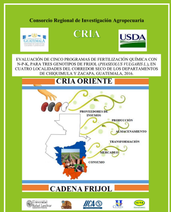 - Este estudio tuvo como objetivo evaluar el efecto de cinco programas de fertilización química con N-P-K en el rendimiento de tres genotipos de frijol (Phaseolus vulgaris L.) en cuatro localidades del Corredor Seco de Chiquimula y Zacapa, Guatemala. La metodología incluyó el establecimiento de parcelas experimentales en cada localidad, donde se aplicaron diferentes dosis y combinaciones de nitrógeno, fósforo y potasio a las variedades de frijol. Los resultados mostraron que el programa de fertilización 50-60-100 N-P2O5-K2O kg/ha, combinado con la variedad ICTA Ligero, incrementó significativamente el rendimiento de frijol en todas las localidades.