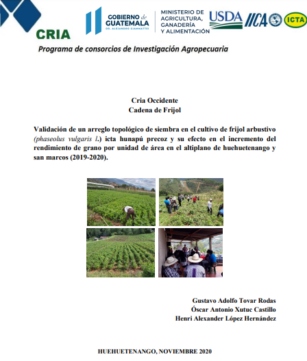 El objetivo del estudio fue validar el efecto de dos arreglos topológicos de siembra en el rendimiento del frijol arbustivo (cultivar ICTA Hunapú Precoz) en el altiplano de Huehuetenango, Guatemala. La metodología se basó en parcelas de prueba pareadas en 15 localidades , donde se compararon un arreglo de 0.3×0.3 m y otro de 0.4×0.3 m contra el método tradicional del agricultor (testigo). Los resultados indicaron que ambos arreglos superaron estadísticamente al testigo , y aunque sus rendimientos fueron similares, el arreglo de 0.4×0.3 m mostró la mejor tasa de retorno económico y la mayor aceptación por parte de los agricultores.