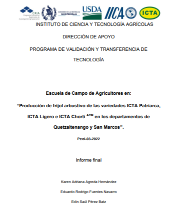 - Las escuelas de campo para agricultores son la forma de enseñanza aprendizaje basada en educación no formal de adultos, donde los productores participantes presentan un grado de experiencia en el cultivo o tecnología a implementar, teniendo en cuenta este principio en los Municipios de San Rafael Pie de La Cuesta y San Pablo en San Marcos y en Génova, Quetzaltenango, se implementaron 3 escuelas de campo una en cada localidad, integrando a 10 participantes entre agricultores y extensionistas en cada ECA, en las que se realizaron 8 sesiones de capacitación esto según el seguimiento requerido de todo el ciclo del cultivo, las variedades de frijol arbustivo que se utilizaron en las parcelas demostrativas y de aprendizaje fueron: ICTA Chortí ACM, ICTA Patriarca e ICTA Ligero, las cuales fueron seleccionadas por las características climáticas de las localidades, además, los agricultores recibieron 2 libras de semilla de cada variedad para replicar en su comunidad, en cada sesión de se contemplaba una práctica de campo según requería el cultivo, se capacitaba y los integrantes presentaban sus experiencias con las parcelas replicadas.