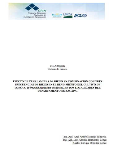 - Este estudio evaluó el efecto de tres láminas y tres frecuencias de riego en el rendimiento del cultivo de loroco en dos zonas de Zacapa. La metodología consistió en establecer experimentos de campo para identificar la combinación óptima. El objetivo principal fue determinar la mejor estrategia de riego para maximizar la producción. Los resultados mostraron que una lámina del 100% ETo con riego cada tres días fue la más efectiva, incrementando significativamente el rendimiento y optimizando los costos de producción.