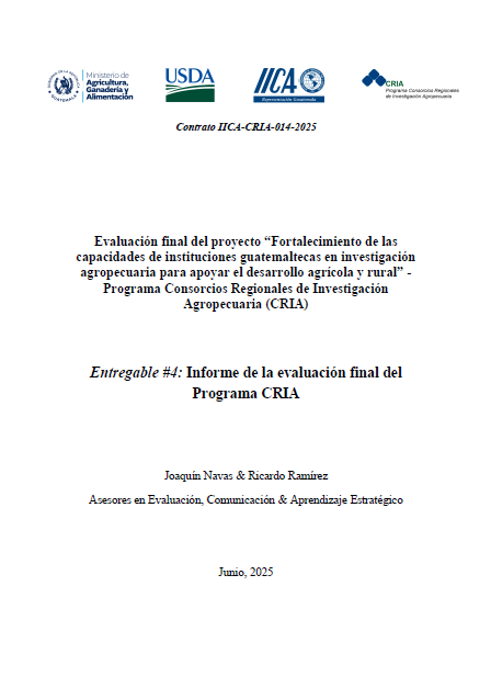 - El informe evalúa el Programa CRIA, cuyo objetivo fue mejorar la productividad agropecuaria familiar y el desarrollo territorial en zonas rurales mediante innovación tecnológica, fortalecimiento institucional y acceso a mercados. La metodología combinó análisis documental, entrevistas, encuestas y talleres participativos en comunidades beneficiarias, con enfoque en pertinencia, eficiencia, eficacia, sostenibilidad e impacto. Los resultados muestran que el programa incrementó ingresos, diversificó la producción y fortaleció capacidades locales, aunque con limitaciones en la articulación interinstitucional y la sostenibilidad financiera a largo plazo. Se recomienda consolidar las alianzas público-privadas y dar continuidad a procesos de capacitación.