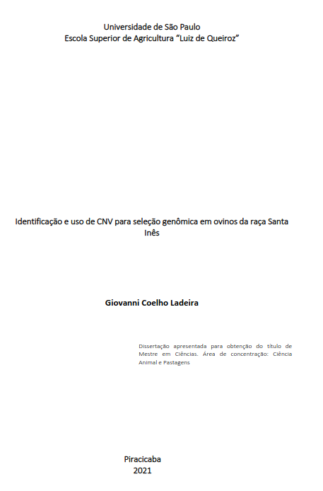 - Variações no número de cópias (CNV) são variações estruturais no DNA de no mínimo 1 kb e que diferem do genoma referência quanto ao número de cópias. O crescente número de estudos com CNV reportam sua associação com doenças em humanos e diversas características quantitativas em animais domésticos. Entretanto, não foram reportados estudos de associação genômica ampla baseados em CNV em ovinos Santa Inês, uma das raças mais importantes do Brasil e, ademais, informações sobre a inclusão de efeitos de CNV em modelos de predição de GEBV são escassos. Assim, os objetivos do presente estudo foram 1) identificar e quantificar CNVs em uma população de ovinos da raça Santa Inês, 2) verificar possíveis associações entre CNVs e características de interesse, 3) identificar possível sobreposição de segmentos de CNVs significativamente associados às características de interesse a QTLs e genes previamente conhecidos, e 4) avaliar possíveis ganhos em acurácia das predições dos GEBVs combinando informações de SNP e CNV (GBa + CNV) comparadas às predições dos GEBVs utilizando exclusivamente informações SNP (GBa). Dessa forma, foram utilizadas informações genômicas de 491 ovinos da raça Santa Inês (OvineSNP50 BeadChip). A identificação de CNVs foi realizada por meio do software PennCNV. As informações de CNVs foram utilizadas para a construção de uma matriz de relacionamento genômico fundamentada em CNVs que foi incorporada ao modelo misto utilizado para a predição dos GEBVs adicionalmente às tradicionais informações de SNP. Na sequência, a acurácia foi estimada pela correlação de Pearson entre os GEBVs preditos para a população de treinamento e o fenótipo corrigido para efeitos fixos na população de validação. Os GEBVs preditos foram utilizados nas análises de associação genômica ampla fundamentadas em CNVs, por meio do programa CNVRanger, para identificar regiões no genoma associadas às características de desempenho, eficiência e carcaça. Foram identificados 1.167 segmentos de CNV, entre eles segmentos significantes (p-valor<0,05) associados às características: rendimento de carcaça e consumo alimentar residual, adicionalmente, outros 5 segmentos de CNV foram considerados relevantes e indicados para estudos futuros. Os segmentos significativos foram sobrepostos a 4 QTLs e 8 genes, entre eles os genes SPAST, TGFA e ADGRL3 com funções relacionadas a diferenciação celular e metabolismo energético. A inclusão de CNV nas análises genéticas permitiram capturar maior variância genética, entretanto a proporção da variância genética capturada por CNVs varia entre as características e não necessariamente incrementam a acurácia de predição. Entre os modelos considerados, não houve incremento na habilidade preditiva ao inserir informações de CNV. Portanto, os resultados reportados no presente estudo indicam que a inclusão de informações de CNV em modelos para predição de GEBV não deve ser prioridade.