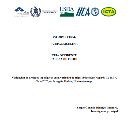 - El crecimiento poblacional demanda mayor producción por unidad de área, lo que ha impulsado la evaluación de distintos arreglos topológicos en cultivos. Este estudio analizó cuatro arreglos (0.30 x 0.20 x 3; 0.30 x 0.30 x 3; 0.40 x 0.20 x 2 y 0.40 x 0.30 x 3, entre surcos, posturas y granos por golpe) en el frijol arbustivo ICTA ChortíACM, variedad destacada por su mayor contenido de hierro y zinc. El ensayo se realizó en cinco parcelas establecidas en noviembre de 2021 en La Democracia, Jacaltenango y Nentón, Huehuetenango, Guatemala, ubicadas entre 718 y 927 m s.n.m., en zona de vida bosque seco subtropical, con temperaturas de 15.1 °C a 31.4 °C. Los resultados mostraron que todos los tratamientos superaron el promedio nacional de rendimiento de 750 kg/ha, con 767, 577, 515 y 383 kg/ha. El arreglo de 0.30 m entre surcos, 0.20 m entre posturas y 3 granos por postura alcanzó el mayor rendimiento, con 1518 kg/ha. Este mismo arreglo había mostrado estabilidad en estudios previos, lo que consolida su eficacia y aceptación entre agricultores. Se recomienda realizar ensayos adicionales que permitan formular recomendaciones prácticas para la producción de frijol en condiciones similares.