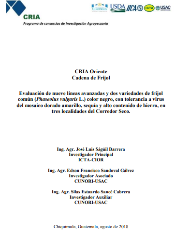 - El objetivo fue incrementar la productividad del frijol negro evaluando nueve líneas avanzadas y dos variedades por rendimiento, tolerancia al virus del mosaico dorado amarillo (BGYMV), sequía y alto contenido de hierro en tres localidades del Corredor Seco de Guatemala. Se usó un diseño de bloques completos al azar. Las líneas ICTA Ju-2013-41 (4103.33kg/ha) e ICTA Ju-2013-40 (3805.37kg/ha) mostraron los mayores rendimientos, ciclo intermedio, resistencia al BGYMV y buena calidad de grano.