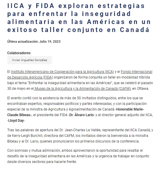 - El IICA y FIDA organizaron un taller conjunto en Canadá para abordar la inseguridad alimentaria en las Américas. El evento contó con la participación de expertos en agricultura y seguridad alimentaria de todo el mundo, quienes discutieron estrategias para mejorar la situación alimentaria en la región. Los panelistas y los invitados coincidieron en la importancia de la colaboración entre gobiernos, organizaciones internacionales y diversas partes interesadas, así como en la necesidad de desarrollar políticas inclusivas y de fomentar la creación de asociaciones que involucren de manera activa a pequeños agricultores, comunidades indígenas y partes interesadas. También se reconoció la invaluable contribución de los conocimientos indígenas y las consideraciones de género como dos elementos fundamentales en el desarrollo de prácticas agrícolas sostenibles. Los expertos abogaron por una transformación social más amplia en respuesta a la urgente necesidad mundial de combatir la crisis climática y las desigualdades.