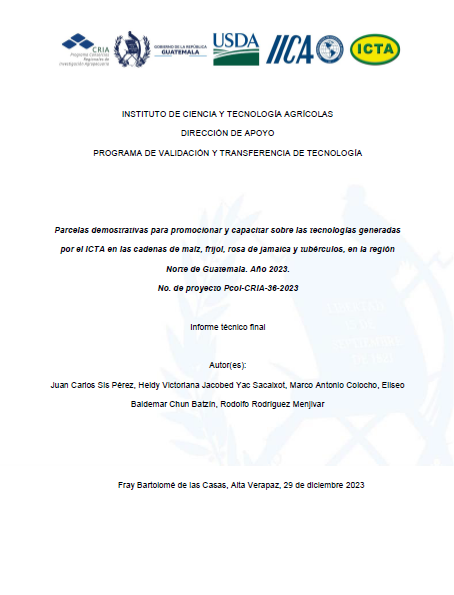 - De acuerdo con el PEI 2021-2032 el presente proyecto tuvo como meta la promoción de las tecnologías agrícolas generadas por el ICTA. Para cumplir con dicho objetivo se establecieron parcelas demostrativas y se realizaron 4 eventos de promoción dirigidos a agricultores, extensionistas, técnicos agrícolas y estudiantes, dónde se presentaron los cultivos de: maíz ICTA HB-17, maíz ICTA B-7, maíz ICTA Grano de Oro, camote ICTA Dorado, rosa de jamaica ICTA Rosicta , yuca ICTA Izabal y frijol ICTA Ligero. Las parcelas demostrativas fueron establecidas en las localidades de los municipios de: Fray Bartolomé de las Casas, A.V; Ixcán, Quiché; San Jerónimo, Baja Verapaz; y Los Amates, Izabal. Al final del proyecto se fortalecieron las capacidades de 600 personas de la Región Norte de Guatemala. Los participantes en su mayoría fueron grupos organizados por Extensión Rural del MAGA, quienes manifestaron su satisfacción por las diferentes experiencias vividas y mostraron interés por participar en eventos futuros. El éxito del proyecto conlleva el reto de que en el futuro el ICTA cuente con semillas de los materiales que se promocionaron. Se recomienda seguir con los eventos promoción y capacitación, ya que ello visibiliza la labor del ICTA. Finalmente se plantea la necesidad de que Extensión Rural del MAGA y el Programa de Socioeconomía Rural del ICTA le den seguimiento a los productores que recibieron semillas, para conocer el nivel de aceptabilidad y adopción que puedan tener dichas tecnologías.