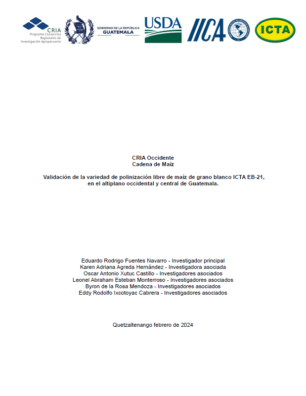 La evaluación de variedades experimentales de maíz de grano blanco en el altiplano de Guatemala en su Fase II, correspondió a la validación de la variedad promisoria de polinización libre de grano blanco ICTA EB-21, para el altiplano occidental y central de Guatemala. Para la investigación se establecieron 57 parcelas para validar el rendimiento, bajo el sistema de manejo de los agricultores. Las parcelas se establecieron en un diseño de parcelas apareadas distribuidas en los departamentos de Quetzaltenango, Huehuetenango, San Marcos, Totonicapán, Sololá, Quiché, Chimaltenango y Sacatepéquez. La Prueba de t de Student, indica que existe diferencia significativa (0.0148) en el rendimiento, para las localidades que fueron establecidas sobre los 2,000 msnm, las medias de rendimiento fueron de 3.84 t ha-1 para ICTA EB.21 y 3.55 t ha-1 para las variedades testigo. Sin embargo, para las localidades con altitudes menores a 2,000 msnm no se recomienda su siembra por presentar bajos rendimientos. La opinión de los agricultores que pudieron conocer la variedad ICTA EB-21 a través de días de campo y evaluaciones participativas, expresaron estar dispuestos a sembrarla nuevamente debido a sus características de rendimiento, vigor, altura de planta, tamaño de mazorca, color y tamaño de grano, por lo que consideran importante incorporarla a su sistema finca. Por tal razón se considera que la variedad puede continuar su proceso para ser liberada como una alternativa tecnológica de semilla mejorada para el altiplano de Guatemala.