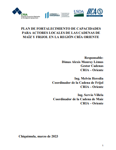 - El plan busca fortalecer las capacidades de los actores en las cadenas de maíz y frijol de la región Oriente de Guatemala para mejorar su producción y comercialización. La metodología se basó en un diagnóstico participativo con productores y técnicos, realizado el 28 de febrero de 2023, para identificar sus necesidades de capacitación en toda la cadena de valor. Como resultado, se priorizaron temas clave como manejo integrado de cultivos, conservación de suelos, control de plagas y estrategias de comercialización para ambos granos.
