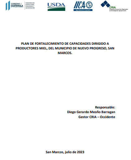 - El plan busca fortalecer las capacidades de los productores de miel del municipio de Nuevo Progreso, San Marcos (Guatemala), para mejorar su producción y comercialización. La metodología se basó en un diagnóstico participativo con la asociación de productores ADASOG para identificar y priorizar sus necesidades en la cadena de valor. Como resultado, se elaboró una estrategia de implementación que incluye capacitaciones priorizadas en temas como control de plagas y enfermedades, nutrición apícola, mejoramiento genético y elaboración de subproductos.