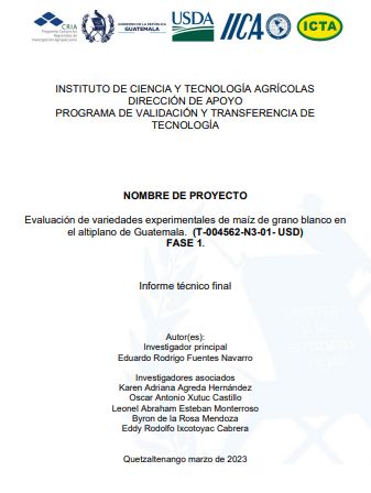 - Evaluación de variedades experimentales de maíz de grano blanco para el altiplano de Guatemala fue realizada con el fin de seleccionar dos variedades con alto potencial de rendimiento, estabilidad y características agronómicas deseables. Se establecen 21 ensayos distribuidos en 6 departamentos, bajo un diseño de bloques completos al azar, con 8 tratamientos y 3 repeticiones, los tratamientos corresponden a 5 variedades de polinización libre de maíz de grano blanco, 2 testigos comerciales y un testigo local. El ANDEVA para las fuentes de variación: tratamientos <0.0001, localidad <0.0001 e interacción tratamientos por localidad <0.0001, fueron altamente significativos. La prueba de medias por DGC, indica que las variedades: testigo del agricultor, ICTA EB18 e ICTA EB-21 presenta rendimientos estadísticamente iguales, con 4,868.39, 4,757.18 y 4,569.32 kg ha-1 respectivamente, siendo los de mayor rendimientos, ubicados en el grupo A de la prueba de medias. El análisis de estabilidad por el modelo AMMI, indica que las variedades, ICTA EB-18 e ICTA EB-21 fueron las más estables y con rendimientos superiores a la media de los ambientes (3,848.89 kg ha-1). Se encuentra diferencia altamente significativa para las variables pudrición de mazorca, presentando menos daño la variedad testigo e ICTA V-301; para la variable cobertura de mazorca también se encuentra diferencia significativa a favor de la variedad ICTA Compuesto Blanco, ICTA EP-19, ICTA EB-19, ICTA SIB-01 y testigo del agricultor con menor número de mazorca con mala cobertura. En base a rendimiento y estabilidad se espera continuar con los procesos de generación de tecnología la variedad ICTA EB-21.