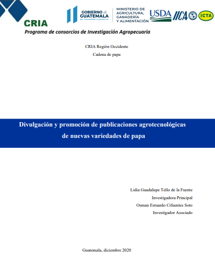 - El proyecto tuvo como objetivo divulgar y promocionar siete nuevas variedades de papa desarrolladas por el ICTA, en alianza con MAGA-USDA-IICA, a través del Programa CRIA. Se realizaron diversas actividades de divulgación y promoción, incluyendo la generación de materiales informativos (trifoliares, manuales), montaje de estands en eventos, publicaciones en medios impresos y digitales, y producción de videos y material promocional. Se buscó dar a conocer las características agronómicas y culinarias de las nuevas variedades de papa a productores y consumidores. Entre los resultados se destaca la edición e impresión de 2,000 ejemplares del manual de cultivo de papa, la elaboración de trifoliares de las variedades ICTA Loman Roja e ICTA Palestina, la publicación de un suplemento en la Revista Guatemala Productiva, la producción de videos promocionales y el montaje de stands en eventos con una asistencia total de 10,000 personas