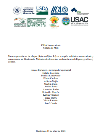 - El objetivo de esta investigación fue evaluar la presencia de moscas parasitarias de abejas (Apis mellifera L.) en la región cafetalera noroccidental y suroccidental de Guatemala, y desarrollar métodos de detección, evaluación morfológica, genética y control. La metodología incluyó la colecta de moscas mediante trampas de luz y atrayentes, la toma de variables climáticas en los apiarios, y el análisis morfológico y genético de las moscas parasitarias en laboratorio. Los resultados preliminares identificaron la presencia de moscas parasitarias en las regiones estudiadas. La investigación permitió caracterizar morfológicamente las especies encontradas y se está trabajando en su identificación genética. Se concluyó que la presencia de estas moscas representa una amenaza para la apicultura local. La información generada es crucial para desarrollar estrategias de control efectivas, contribuyendo a la salud de las colonias de abejas y a la sostenibilidad de la producción de miel en Guatemala.
