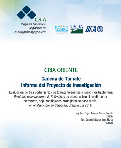 - Este estudio evaluó la tolerancia a la marchitez bacteriana en tres portainjertos de tomate y su efecto en el rendimiento en Camotán, Chiquimula. La investigación se realizó en la Finca La Nobleza, donde se evaluó la tolerancia a la marchitez bacteriana, el rendimiento y el análisis económico de los tratamientos. Se utilizó un diseño de bloques completos al azar con 8 repeticiones y 3 tratamientos. Los resultados mostraron que el portainjerto Shelter RZ presentó mayor tolerancia a la marchitez bacteriana, mientras que el XR 500 obtuvo el mayor rendimiento.
