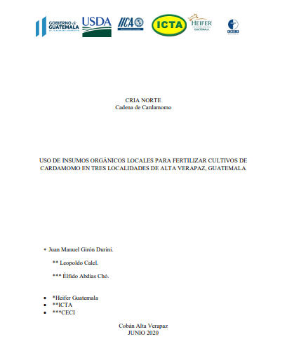 - Este estudio evaluó el uso de abonos orgánicos para mejorar el rendimiento y la calidad del cardamomo en Alta Verapaz, Guatemala, donde la baja calidad del grano es un problema significativo debido a la baja fertilidad del suelo y el manejo agronómico deficiente. Se aplicaron abonos Bocashi y microorganismos eficientes (ME) en seis tratamientos con cuatro repeticiones en tres localidades. Los resultados mostraron que los tratamientos con Bocashi y ME mejoraron el rendimiento y la densidad del grano. El tratamiento con 2 libras de Bocashi y 1 litro de ME fue el más efectivo y ha aumentado significativamente la producción de los agricultores.