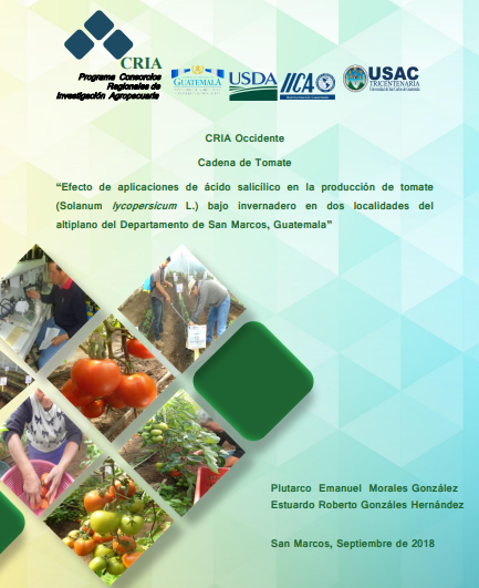 - El informe investiga el efecto de las aplicaciones de ácido salicílico en la producción de tomate (Solanum lycopersicum L.) bajo invernadero, en dos localidades del altiplano de San Marcos, Guatemala. El objetivo principal fue determinar si el ácido salicílico puede mejorar el rendimiento y la calidad de los frutos. La metodología consistió en la aplicación de diferentes concentraciones de ácido salicílico a las plantas de tomate y el monitoreo de variables agronómicas como crecimiento, floración y producción. Los resultados mostraron que las aplicaciones de ácido salicílico tuvieron un impacto positivo en la producción, sugiriendo una estrategia para optimizar el rendimiento del cultivo.
