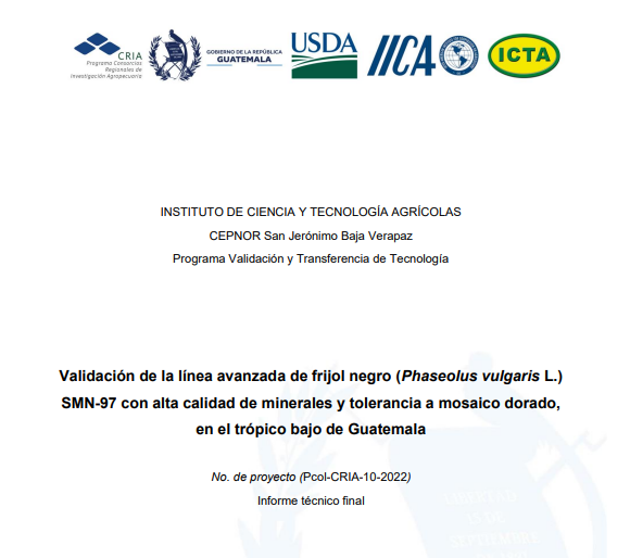 - El frijol negro en Guatemala es uno de los cultivos de mayor importancia, esto porque constituye parte esencial en la dieta de los guatemaltecos. Según las estadísticas año con año se viene aumentando la producción de frijol por la demanda que se tiene, ya que los niveles de consumo varían de acuerdo al estrato económico, en las áreas rurales es donde se consume más este grano. Con base a lo anterior y con el objetivo evaluar el potencial de rendimiento de la línea SMN-97, en comparación con los testigos locales, bajo el sistema de manejo de los productores, como también conocer la aceptación de los productoras a través de una boleta de participación, se establecieron parcelas de prueba en diferentes municipios del departamento de Baja Verapaz, en la época de agosto a diciembre 2022 y parcelas en la región de Ixcán Playa Grande, en los meses de noviembre, diciembre 2022 a enero 2023, región de Guatemala donde tiene cobertura el Programa CRIA. Para la región de Baja Verapaz en la prueba de hipótesis mediante la prueba de T, para la variable rendimiento, de la línea promisoria de frijol ICTA SMN97 existieron diferencias estadísticas significativas con relación a la variedad del productor, un p-value de 0.001 la variedad ICTA SMN 97 tuvo un promedio 1537.88 kg/ha. Los testigos de 938.29 kg/ha. Se recomienda su liberación para la región. Para la región de Ixcán Playa Grande, a través del análisis se determinó que no hay diferencia significativa, por lo tanto, para esta zona no se recomienda su liberación, ya que no superó al testigo.