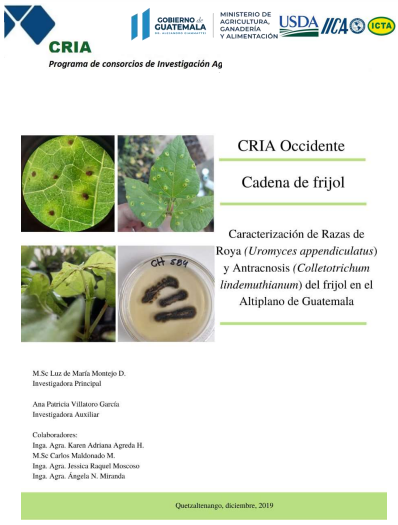 - El estudio tuvo como objetivo caracterizar razas de roya (Uromyces appendiculatus) y antracnosis (Colletotrichum lindemuthianum) del frijol en el Altiplano de Guatemala. La metodología incluyó la recolección de muestras de hojas de frijol con síntomas de ambas enfermedades en diferentes municipios de los departamentos de Quetzaltenango, Totonicapán y Chimaltenango. Se realizaron aislamientos de los patógenos y pruebas de patogenicidad. Los resultados identificaron la presencia de diversas razas de ambos hongos, lo que resalta la variabilidad genética de estos patógenos en la región y su implicación para el desarrollo de variedades resistentes.