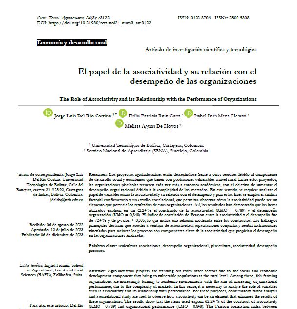 - Los proyectos agroindustriales están destacándose frente a otros sectores debido al componente de desarrollo social y económico que tienen con poblaciones vulnerables a nivel rural. Entre estos proyectos, las organizaciones piscícolas recurren cada vez más a entornos académicos, con el objetivo de aumentar el desempeño organizacional debido a la complejidad de los mercados. En este sentido, se requiere analizar el papel de variables como la asociatividad y su relación con el desempeño y para estos fines se emplea el análisis factorial confirmatorio y un estudio correlacional, que permitan observar cómo la asociatividad puede ser un elemento que potencie los resultados de estas organizaciones. Así, los resultados han demostrado que los ítems utilizados explican en un 62,24 % el constructo de la asociatividad (KMO = 0,789) y el desempeño organización (KMO = 0,848). El índice de correlación de Pearson entre la asociatividad y el desempeño fue de 72,4 % y de p-valor < 0,005, lo que indica una relación moderada entre los constructos. Los hallazgos principales destacan que acceder a ventajas de asociatividad, capacitaciones conjuntas y recibir instrucciones vinculadas para mejorar los procesos son componentes clave de la asociatividad que propician el desempeño en las organizaciones analizadas.