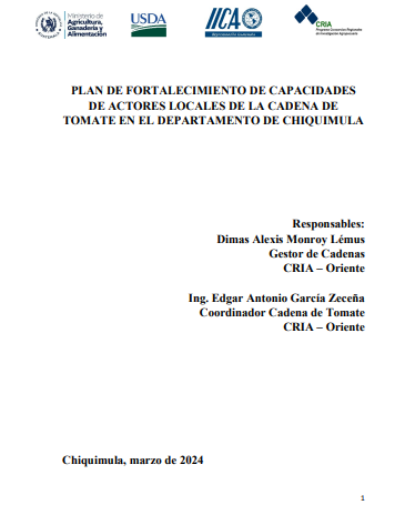 - El plan busca fortalecer las capacidades de los actores de la cadena de tomate en Chiquimula, Guatemala, para mejorar su producción y comercialización. La metodología consistió en un diagnóstico participativo con productores y extensionistas para identificar y priorizar sus necesidades de capacitación en cada eslabón de la cadena. Como resultado, se elaboró una estrategia de implementación con un cronograma detallado que incluye diez capacitaciones, una gira de intercambio y la entrega de insumos, abordando temas desde el manejo de viveros hasta finanzas rurales.