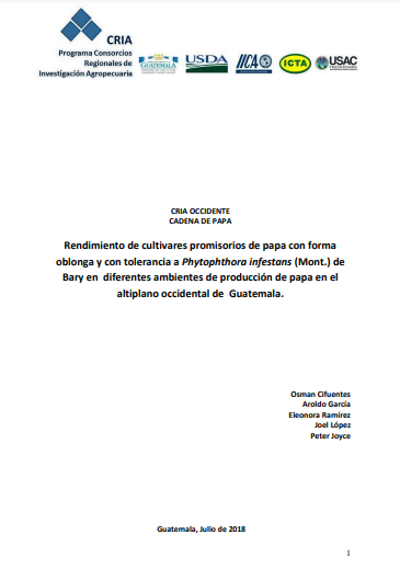 - El estudio evaluó el rendimiento de cultivares promisorios de papa con tolerancia a Phytophthora infestans (tizón tardío) en el altiplano occidental de Guatemala. Se buscó identificar variedades con características comerciales similares a la variedad Loman, pero con mayor tolerancia al tizón tardío, para reducir la dependencia del control químico y los costos de producción. Se establecieron experimentos en diferentes ambientes de producción de papa en la región, analizando el rendimiento de los cultivares y su resistencia a la enfermedad. Los resultados mostraron diferencias en el rendimiento y la tolerancia al tizón tardío entre los cultivares evaluados. Se identificaron algunos cultivares con buen potencial de rendimiento y tolerancia a la enfermedad, lo que sugiere la posibilidad de ofrecer alternativas a los productores.