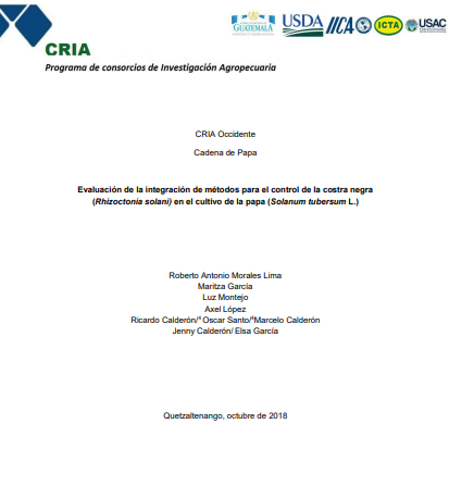 - Este estudio evaluó la integración de métodos para controlar la costra negra (Rhizoctonia solani) en el cultivo de papa en Guatemala. El objetivo fue reducir los daños en la piel del tubérculo, combinando control biológico (Trichoderma), control químico (Benzimidazol/Thiabendazole) y prácticas como solarización y encalado. Los ensayos se establecieron en Paquix (Chiantla, Huehuetenango) y Los Laureles (Palestina de los Altos, Quetzaltenango). Se utilizó un diseño de bloques completos al azar con cinco tratamientos. Los resultados mostraron reducciones evidentes de costra negra, con solo trazas de la enfermedad en la piel del tubérculo. Sin embargo, se identificaron otros problemas como la presencia de Ralstonia solanacearum y Streptomyces ssp. Se concluyó que la integración de métodos reduce la costra negra, pero se deben considerar otros patógenos para un control integral.
