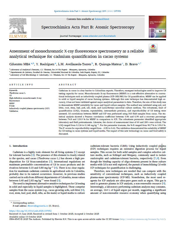 Cadmium in cacao is a key barrier to Colombian exports. Therefore, emergent technologies need to improve Cd testing capacity for cacao. Monochromatic X-ray fluorescence (MXRF) is a cost-effective alternative to conventional techniques such as inductively coupled plasma (ICP-OES/MS) for Cd quantification. MXRF can be applied to solid or liquid samples of cacao farming systems. Although this new technique has demonstrated high accuracy, it has not been validated against major analytical parameters to date. Therefore, the aim of this study was to demonstrate MXRF suitability for cacao and liquid culture samples. The method was validated using soil, soil litter, root, stem, leaf, pod, nib, shell, and Luria-Bertani microbial culture medium. The robustness, limit of quantification (LOQ), trueness, repeatability, intermediate precision, and reproducibility of Cd testing were assessed. Cd correlations between MXRF and ICP was performed using 363 field samples from cacao. The statistical analysis showed a Pearson correlation coefficient between 0.96 and 0.99 and a recovery percentage between 74.8 and 129.9 % for MXRF in comparison to ICP. The robustness parameter identified appropriate laboratory and field pretreatments. Likewise, the choice of measurement time of 60 and 200 s was critical. The LOQ ranged from 0.124 to 0.148 mg kg 1. For the parameter trueness, the % R ranged from 90.7 % to 109.0 %. The Z’-scores for reproducibility ranged from 0.50 to 0.62. The validation demonstrated the suitability of MXRF for Cd testing in cacao systems and liquid media. The impact of this new technology on cacao and food safety is discussed.