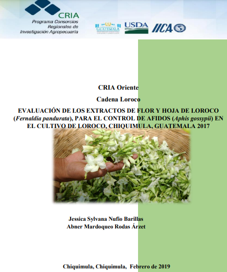 - El objetivo de la investigación fue evaluar la efectividad de cuatro extractos vegetales (chitrá, ajo, jengibre y ruda) para el manejo de áfidos en el cultivo de loroco en Zacapa y Chiquimula. La metodología implicó la aplicación de estos extractos en parcelas experimentales infestadas con pulgones, comparando los resultados con un testigo sin aplicación. Se utilizó un diseño experimental específico y análisis estadísticos. Los principales resultados indicaron que los extractos de chitrá y ajo mostraron mayor efectividad en la reducción de la población de áfidos, presentándose como alternativas promisorias para un control más ecológico.