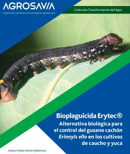- Los cambios en las tendencias de consumo, las ventajas competitivas de estas estrategias de manejo, las nuevas regulaciones y los planes gubernamentales han llevado a que cada vez más productores incorporen estas medidas de control dentro de sus esquemas de manejo de plagas y enfermedades. Por lo anterior, la Corporación Colombiana de Investigación Agropecuaria (AGROSAVIA), desde 2008, ha trabajado en el desarrollo y registro del bioplaguicida Erytec® para el manejo del principal insecto plaga de los cultivos de caucho y yuca en América tropical y Colombia, conocido comúnmente como gusano cachón [Erinnyis ello (Lepidoptera:Sphingidae)]. Este bioplaguicida se desarrolló a partir de un aislamiento nativo de granulovirus colectado en el departamento del Meta, Colombia, y presenta una formulación de alta calidad que le confiere ventajas técnicas para el control de la plaga y su uso en estos sistemas productivos.