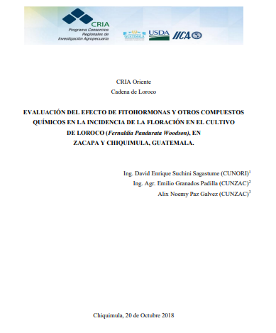 - Este estudio evaluó el efecto de cinco fitohormonas en la floración del cultivo de loroco en Zacapa y Chiquimula durante el verano de 2018. Se empleó una metodología de bloques completos al azar en cuatro localidades. El objetivo principal fue determinar su impacto en el rendimiento y la floración. Los resultados mostraron que las fitohormonas incrementaron la producción y adelantaron la floración. El tratamiento Silver (T3) destacó por su mayor rendimiento y rentabilidad.