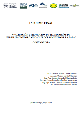 - El objetivo principal fue validar y promover el uso de fermentados líquidos de gallinaza (Biol) y otras fuentes de materia orgánica para la fertilización de la papa, así como el procesamiento del tubérculo en diferentes municipios de Quetzaltenango. La metodología incluyó la validación de estos fertilizantes orgánicos en parcelas experimentales y la capacitación a productores sobre su formulación y aplicación, además de la promoción de tecnologías de procesamiento de papa. Los resultados muestran la eficacia del Biol en la mejora de la productividad y la sustitución de la gallinaza, así como la diversificación en el uso de la papa. En conclusión, estas tecnologías orgánicas ofrecen una alternativa sostenible y económicamente viable para los agricultores, mejorando la producción y agregando valor al cultivo.