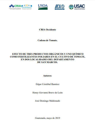 - El documento evalúa el efecto de tres productos orgánicos y uno químico como fertilizantes foliares en el cultivo de tomate, en dos localidades de San Marcos, Guatemala. El objetivo principal fue determinar la influencia de estos fertilizantes en el rendimiento y la calidad del fruto. La metodología consistió en establecer ensayos experimentales con diferentes tratamientos de fertilización foliar y monitorear variables agronómicas clave. Los resultados mostraron que la aplicación de los fertilizantes foliares orgánicos y químicos tuvo un impacto positivo en el desarrollo y la producción del tomate, ofreciendo opciones para mejorar la productividad en la región.