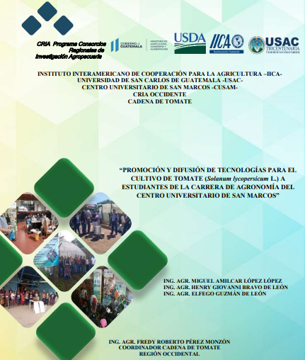 - El informe final describe un proyecto de promoción y difusión de tecnologías para el cultivo de tomate a estudiantes de Agronomía del Centro Universitario de San Marcos. El objetivo fue transferir tecnologías generadas por la cadena de tomate de CRIA Occidente. La metodología incluyó la implementación de una parcela demostrativa, giras de campo, capacitaciones en campo y entrega de catálogos y material educativo. Los resultados mostraron la adopción de nuevas tecnologías por parte de los estudiantes y productores, mejorando los conocimientos y prácticas agrícolas para una producción más eficiente y sostenible de tomate.